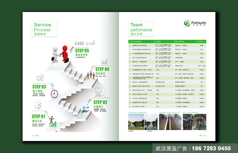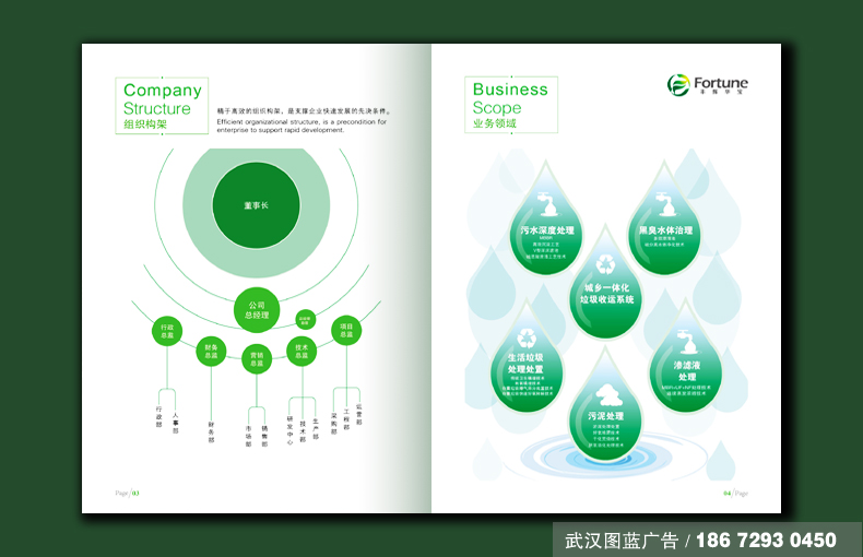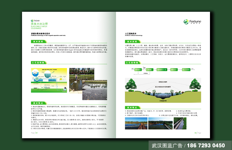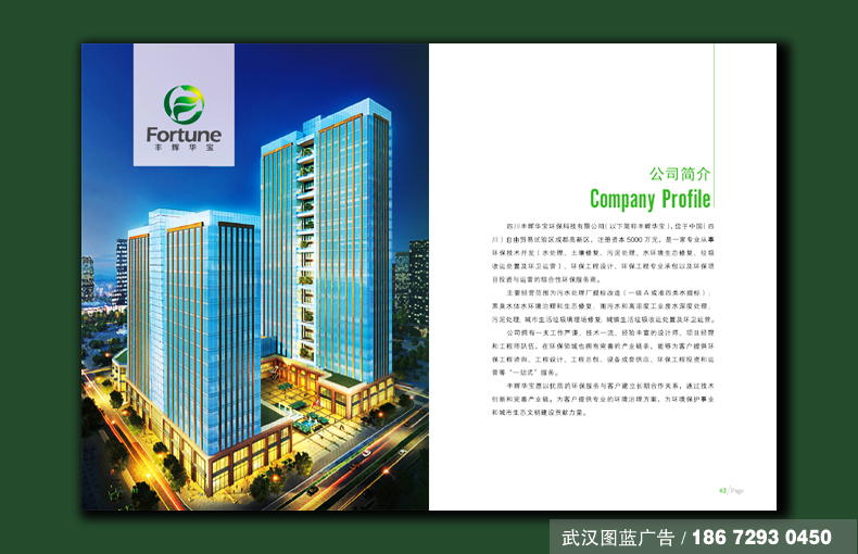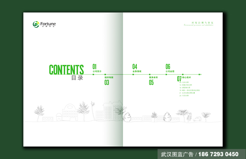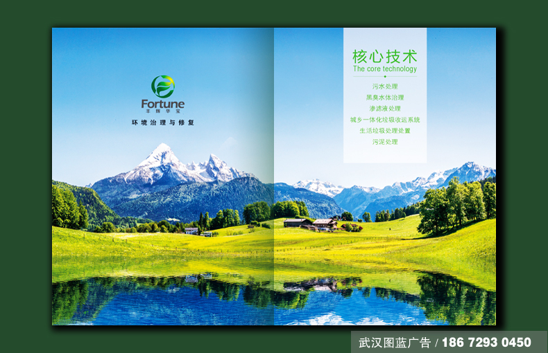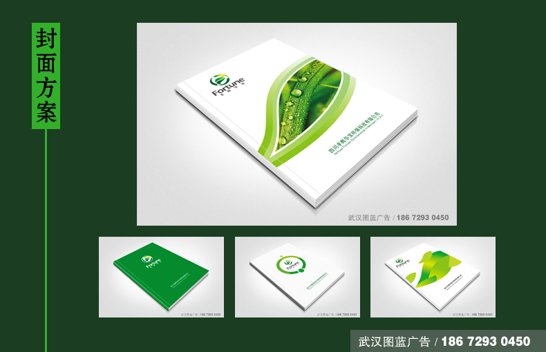畫冊設計解決方案:畫冊設計根據公司LOGO以綠色為基調,英文名“Fortune”是財富、運氣,既強調了環保即財富又雙關了公司能聚集財富。