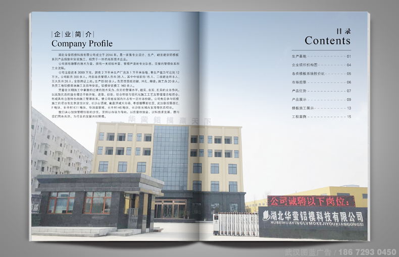 畫冊設計解決方案:畫冊采用210x285mm的尺寸設計,整本畫冊的設計以其黑色為主色調設計,以富有金屬質感的圖形將畫冊封面切割,公司產品(鋁模)放置畫冊的封面上方,下面為公司名稱,整個畫冊封面的設計不僅極有質感,而且主題突出。畫冊的內頁主要為產品介紹,將公司主要產品全方位地展示了出來。